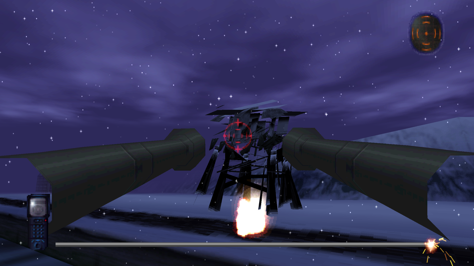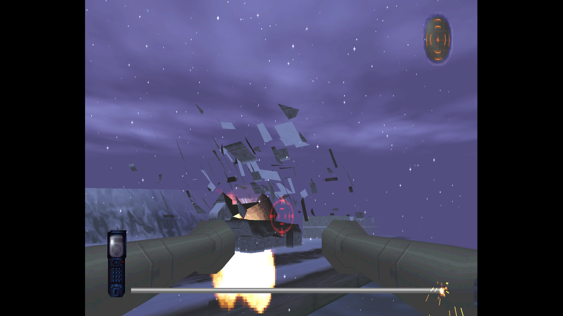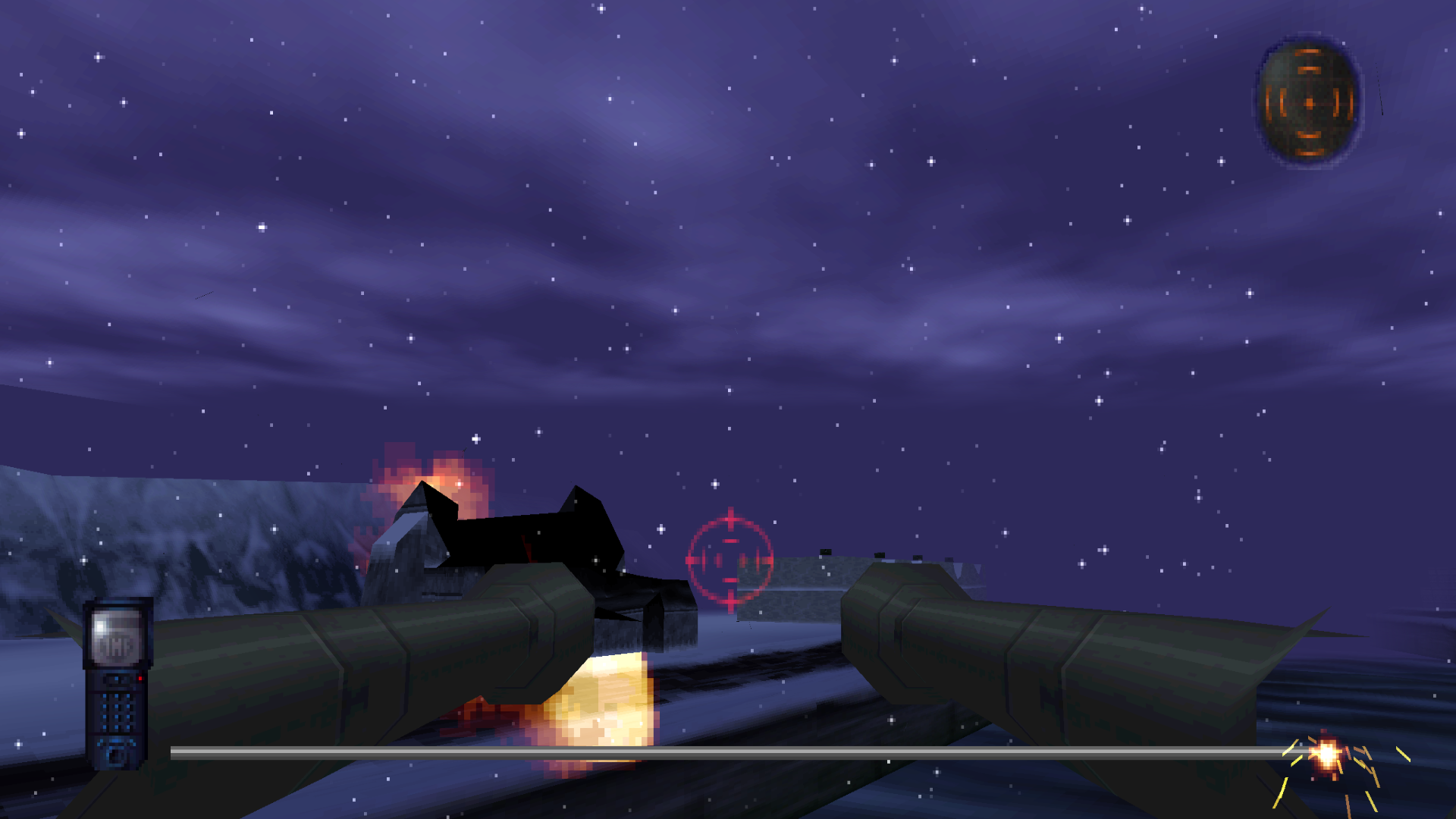The ending level is pretty entertaining. You pilot a gunship in first person view, and are tasked with blowing up everything you see as you escape on a river. The explosion effects are pretty good! Here you can also see one of the only places where Widescreen Hack falls short in this game; the widescreen view lets you see the end of the cannons, which (as you would expect) weren’t originally rendered to be much bigger than what you could see on the screen.