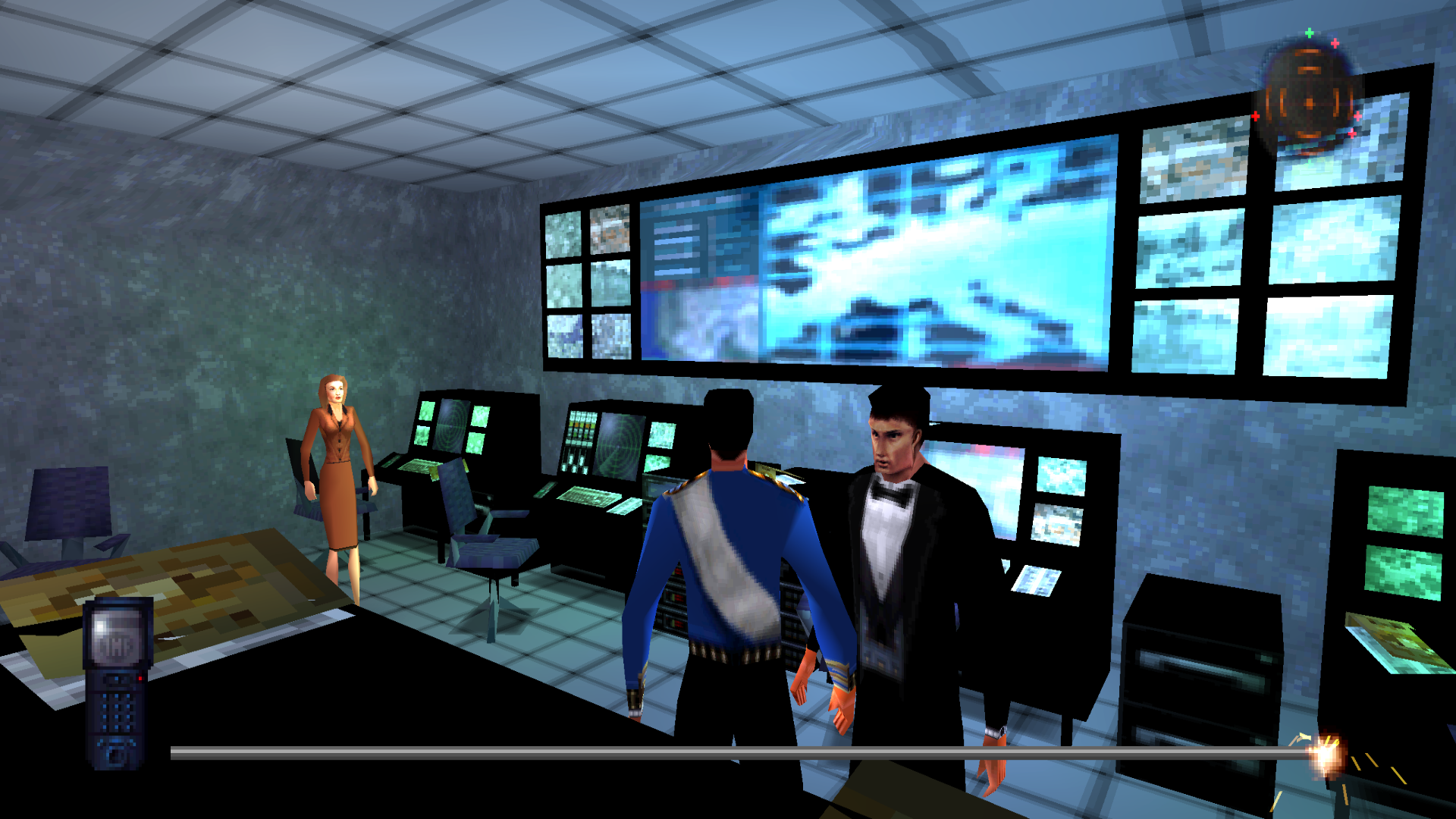 Skipping ahead to the ending for a brief moment, look at all the original-sized icons on the 4:3 display, which is how the game was intended to be played. Not only does the phone look too skinny, but the aiming reticle and radar display are squished too! Strangely, they look a lot better when stretched to the wide frame.