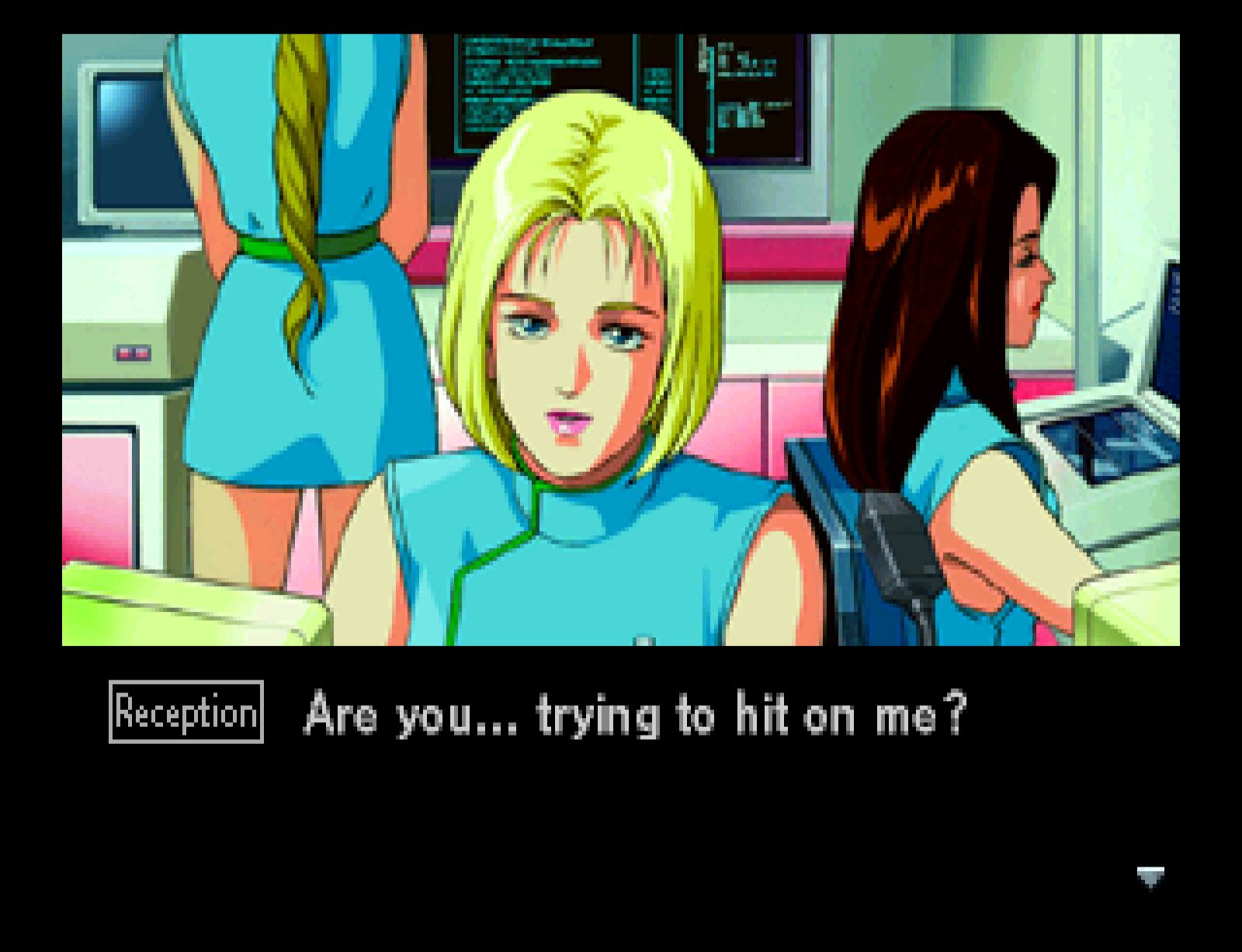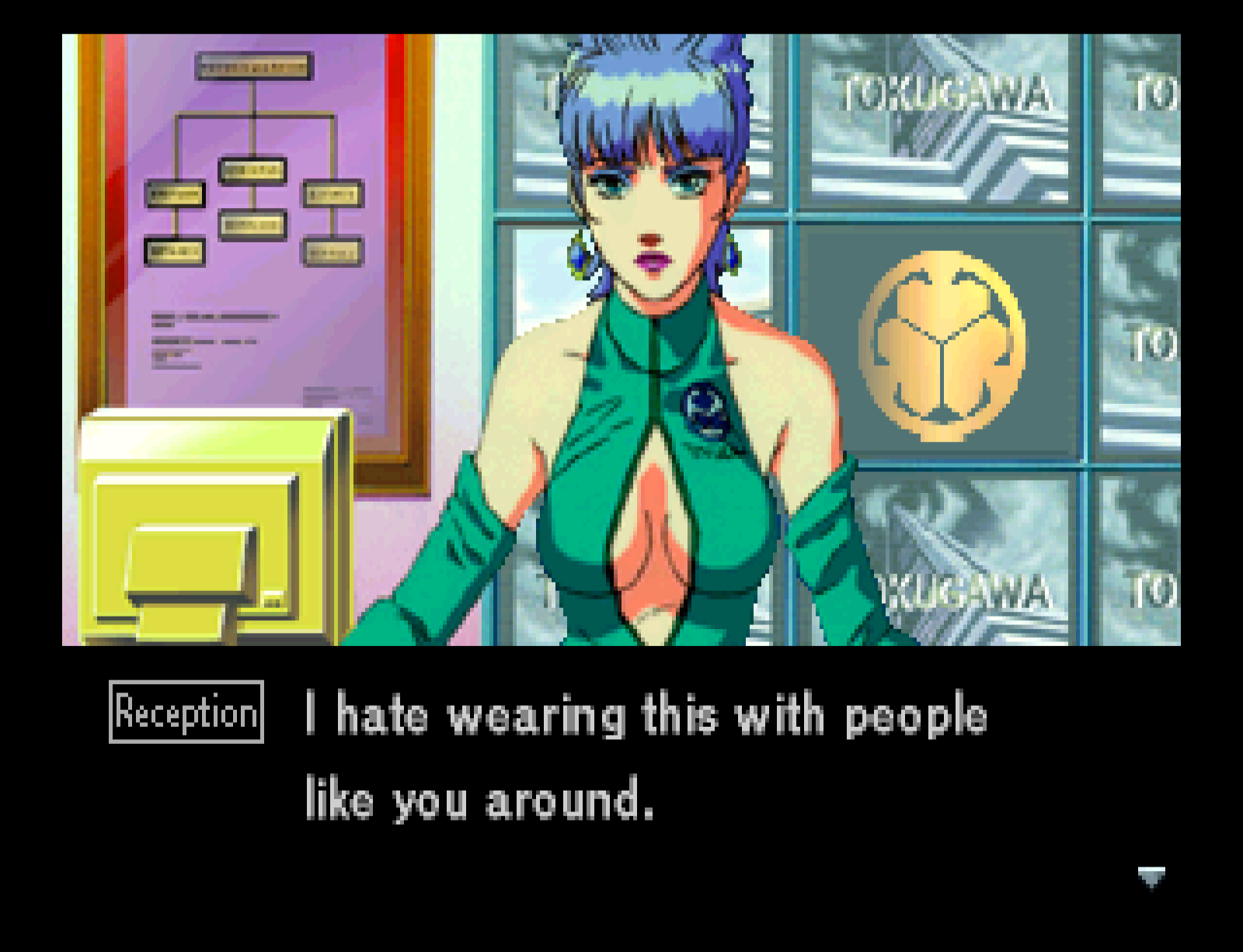 Thankfully though, this game presents two sides to the coin: usually with Jonathan laying it on thick, and the female target rebuffing him. On another Kojima note: Tokugawa Industries was also reused for Metal Gear Solid 2.