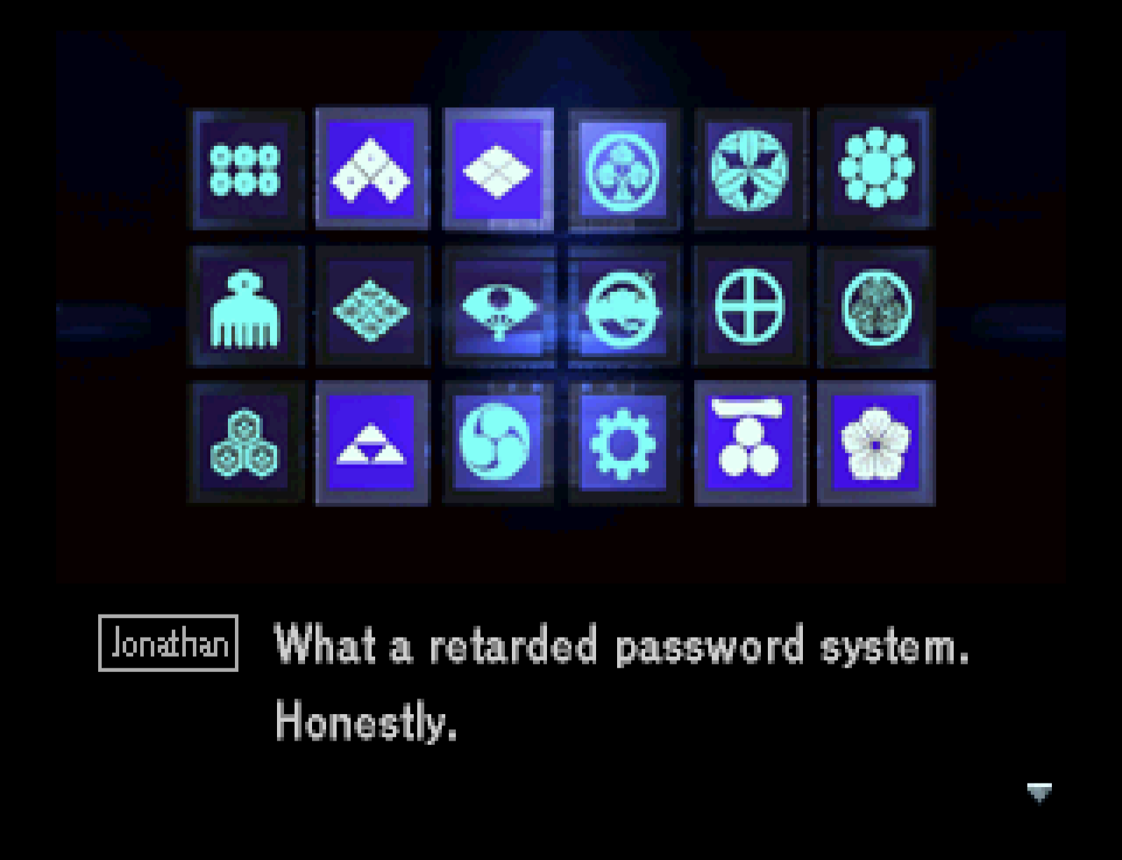 Can’t disagree with that sentiment. Using the game’s instruction manual, you have to solve this incredibly obtuse puzzle using a collection of family crests. This is one of most painfully awkward parts of the game; it was probably a hassle 30 years ago, and it hasn’t gotten better with age. But it does show that Kojima had fourth-wall breaking ideas well before you had to find Meryl’s codec frequency by looking at the back of the game case.