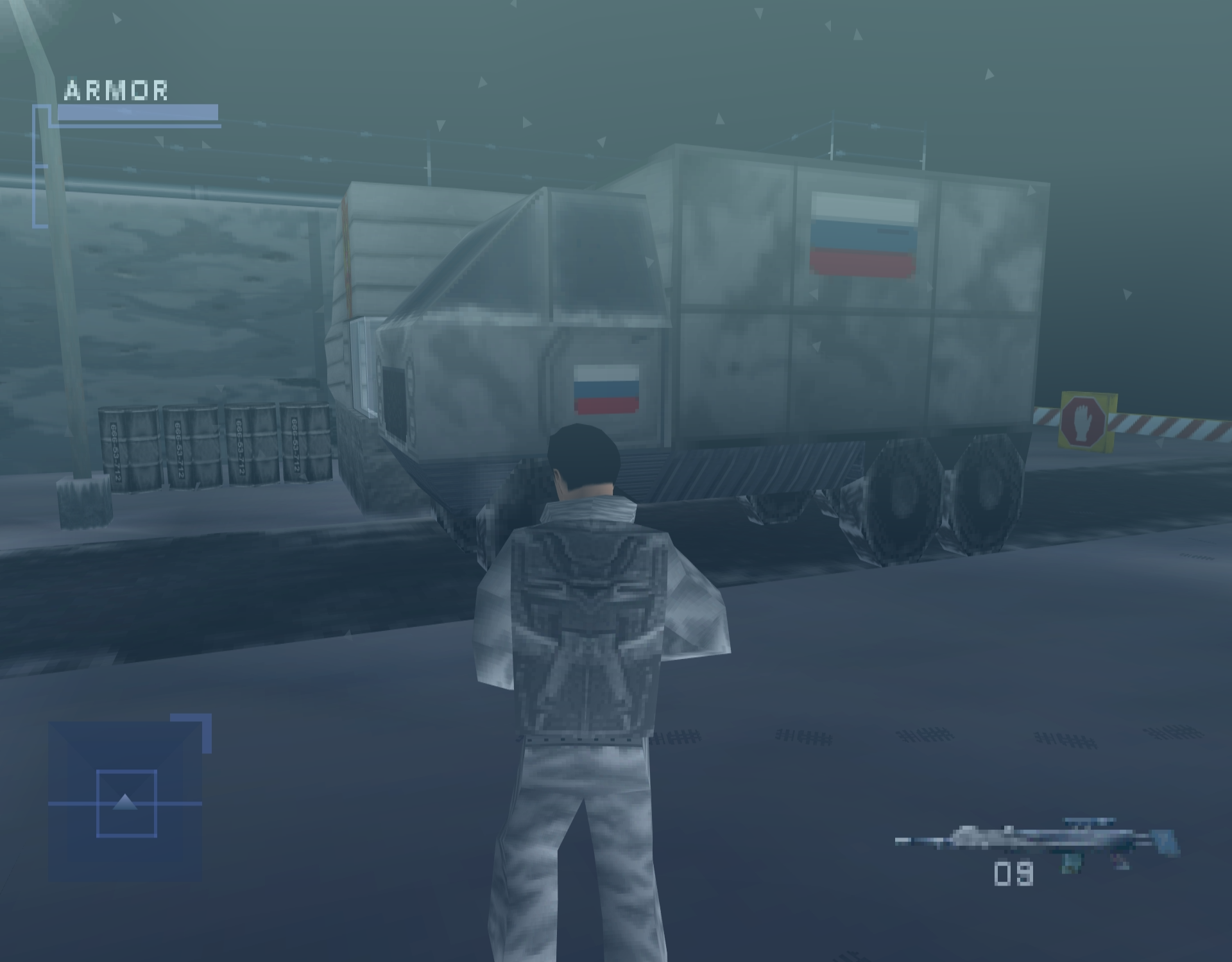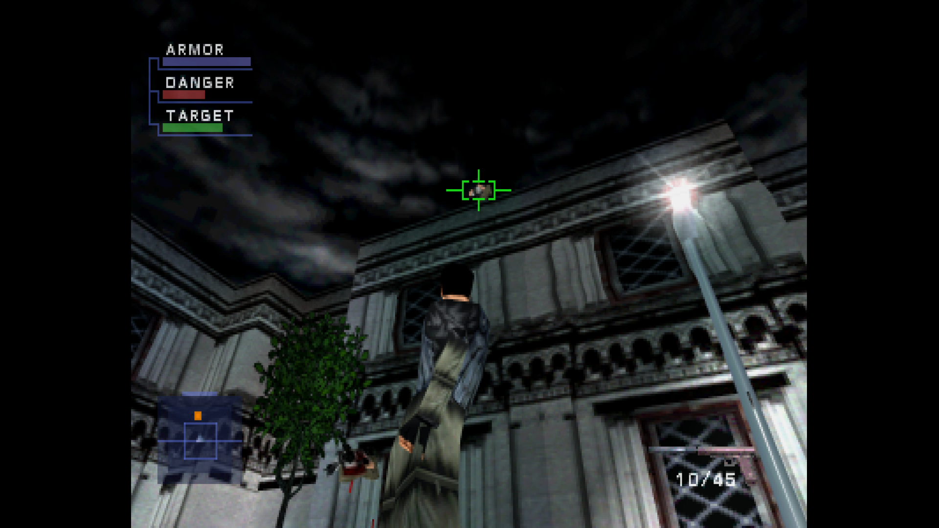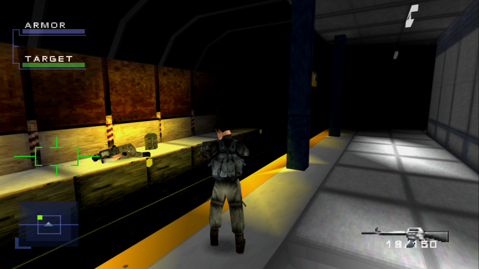 Like Mission: Impossible, Syphon Filter offers two targeting modes: R1 is an “auto-target” mode, and L1 is first person manual aiming view. This is so much slicker than Mission: Impossible, which has an auto-aim function that doesn’t tell you where you’re aiming, so it’s very difficult to not shoot innocent NPC’s when you’re trying to kill a baddie. Unfortunately, this is the main casualty of the widescreen hack and the reason why I chose to play this game without it: the further the aiming reticle is from the center of the screen, the more mis-aligned it gets. In the above screenshot, the reticle is ostensibly locked on to the enemy on screen.