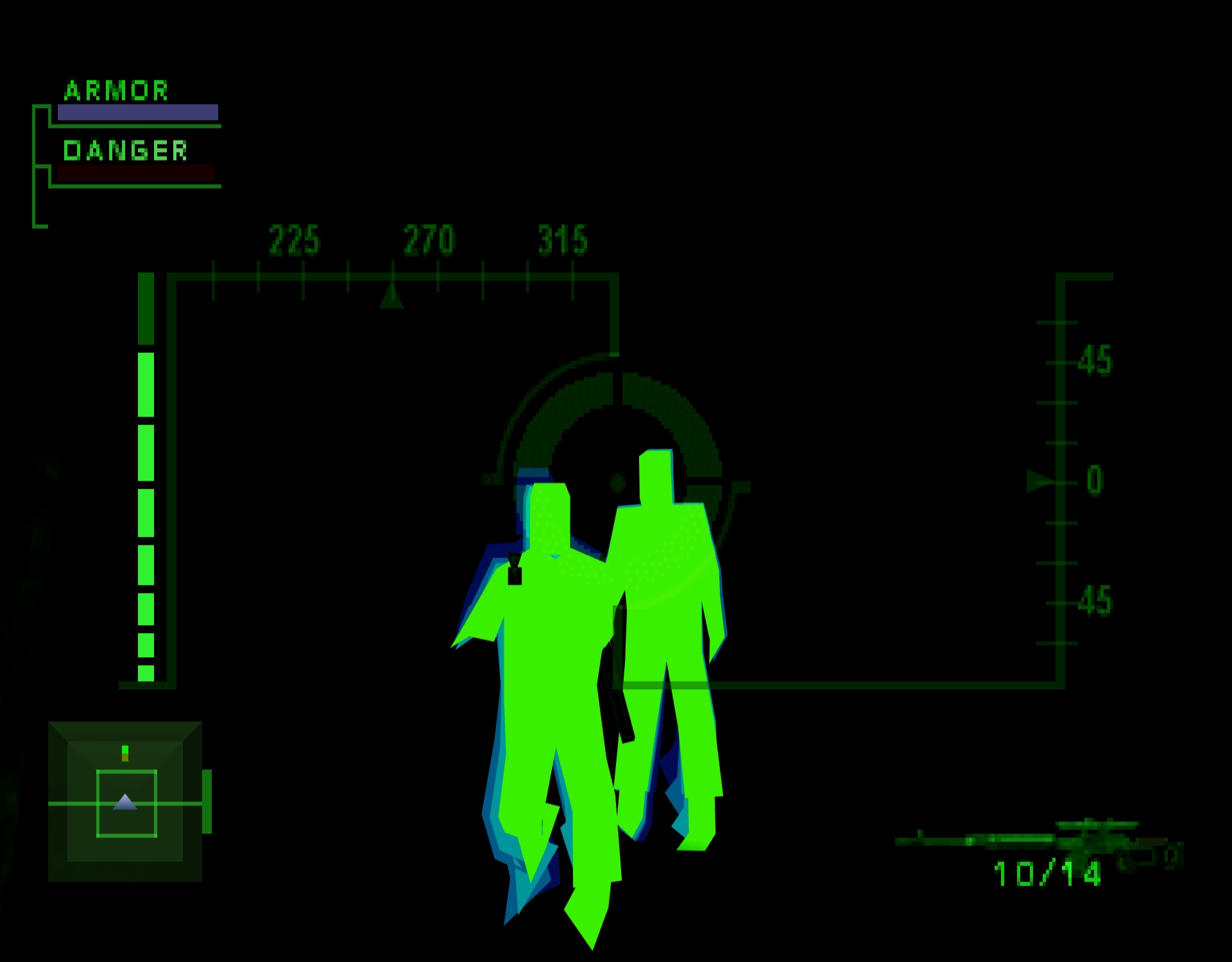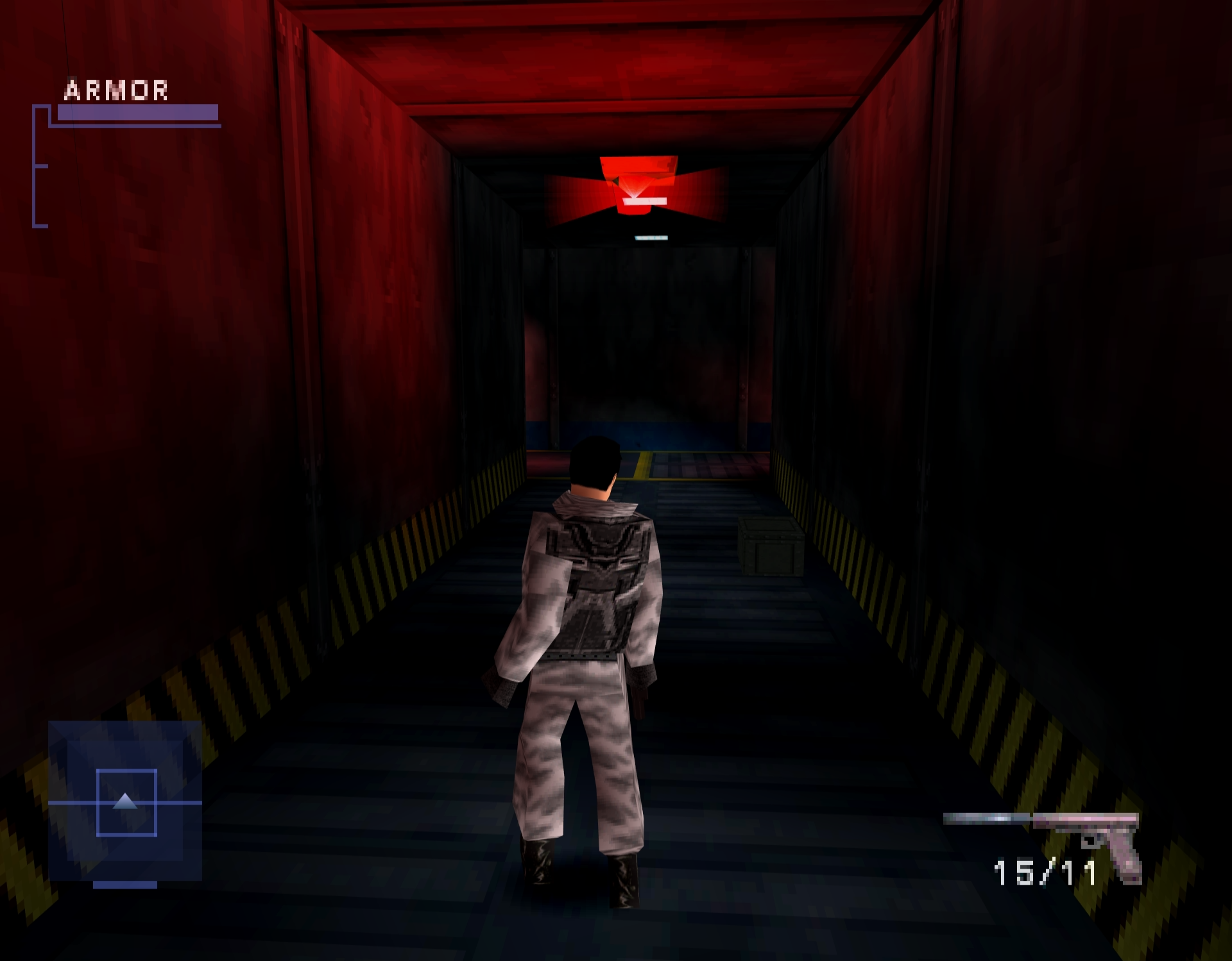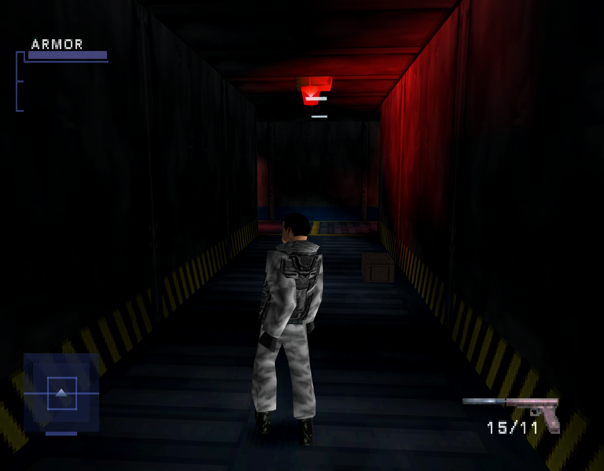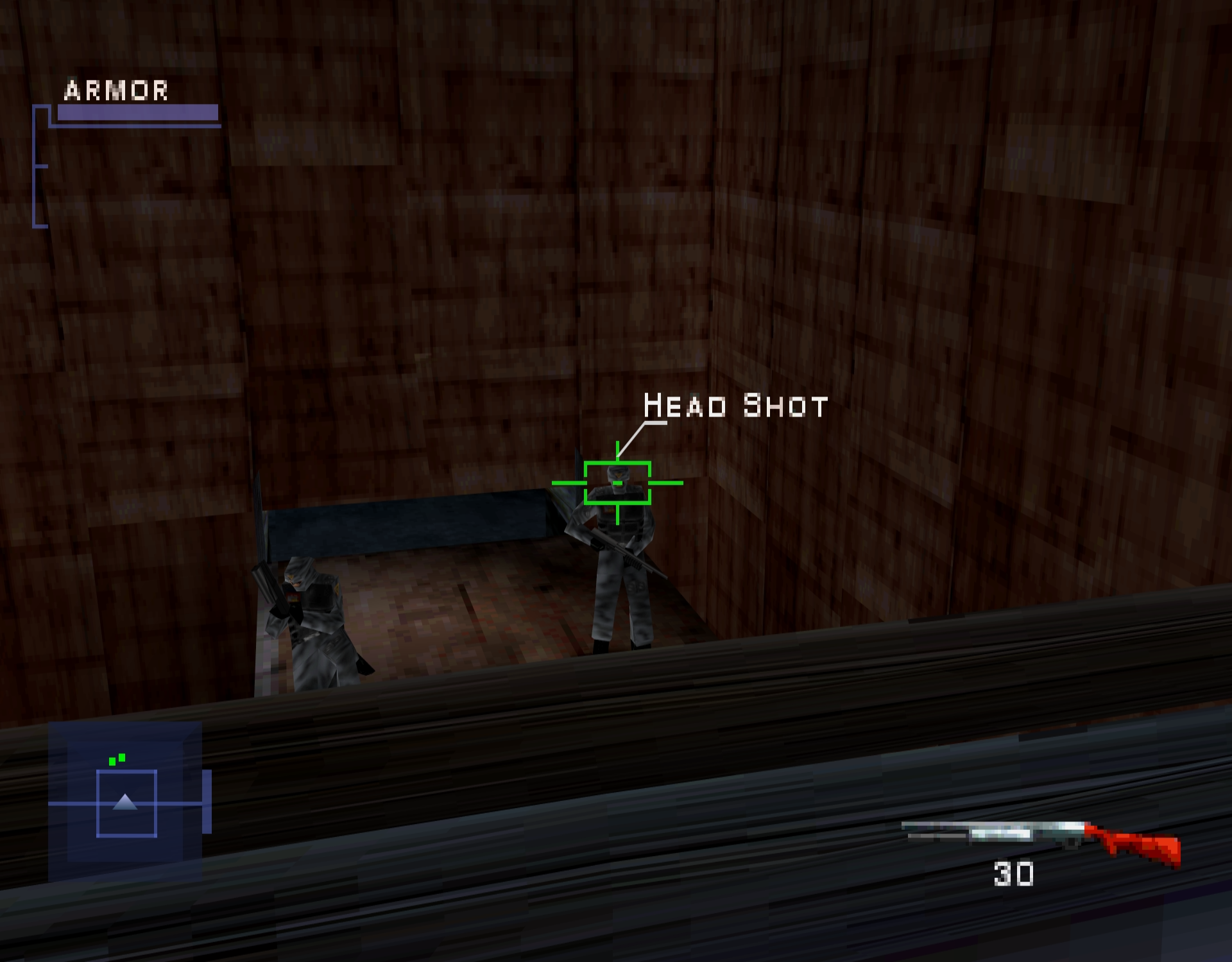 Like Mission: Impossible, Syphon Filter offers two targeting modes: R1 is an “auto-target” mode, and L1 is first person manual aiming view. This is so much slicker than Mission: Impossible, which has an auto-aim function that doesn’t tell you where you’re aiming, so it’s very difficult to not shoot innocent NPC’s when you’re trying to kill a baddie. Unfortunately, this is the main casualty of the widescreen hack and the reason why I chose to play this game without it: the further the aiming reticle is from the center of the screen, the more mis-aligned it gets. In the above screenshot, the reticle is ostensibly locked on to the enemy on screen.