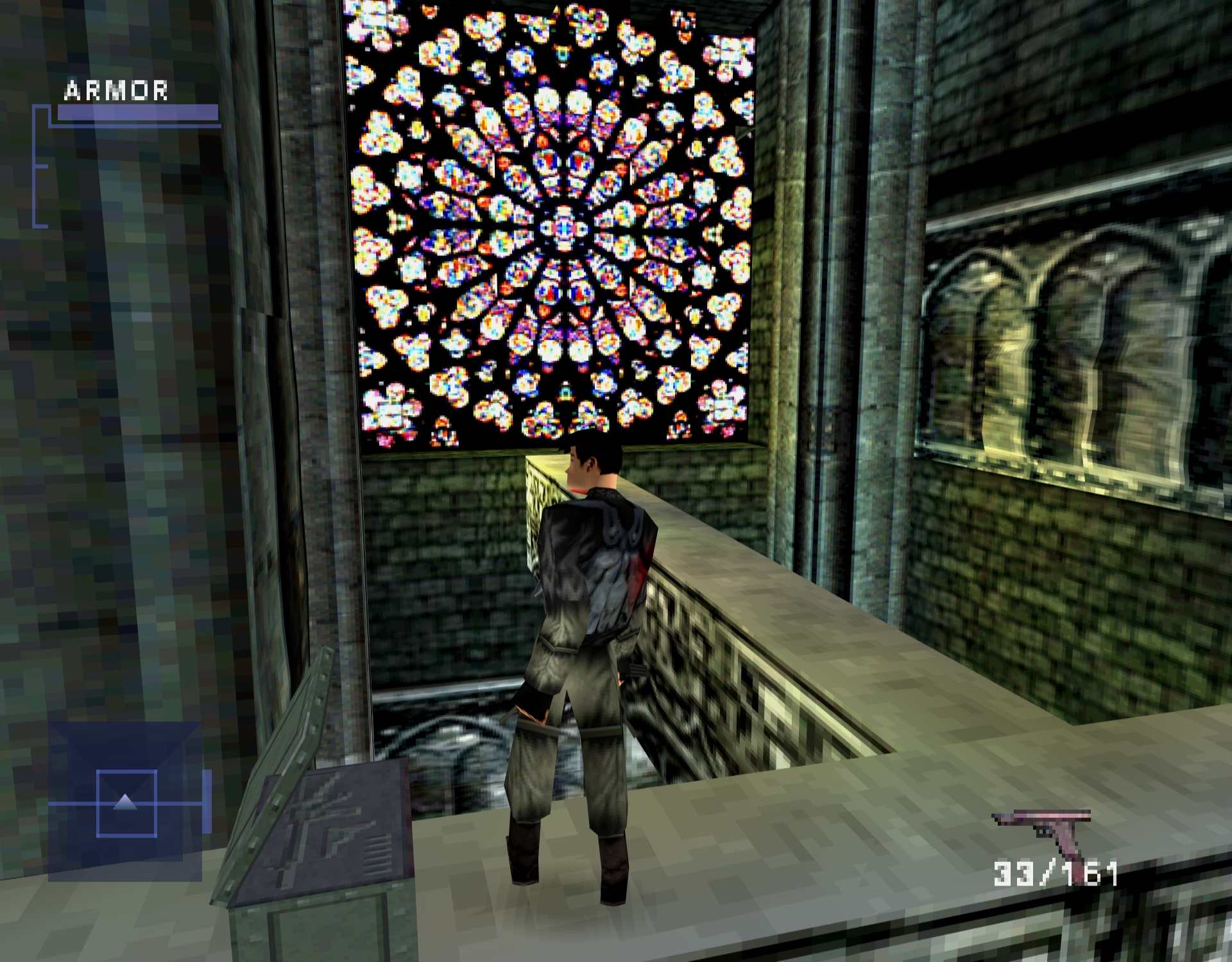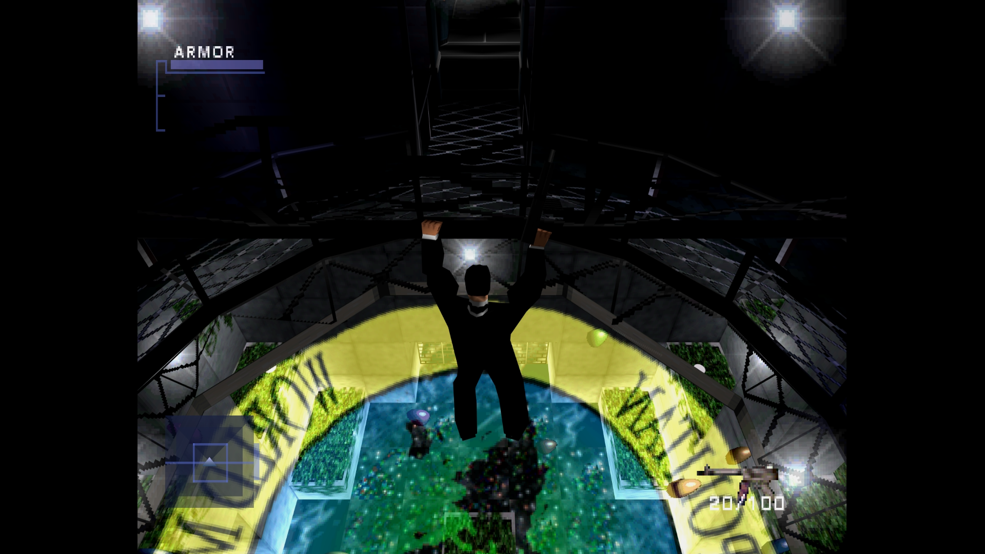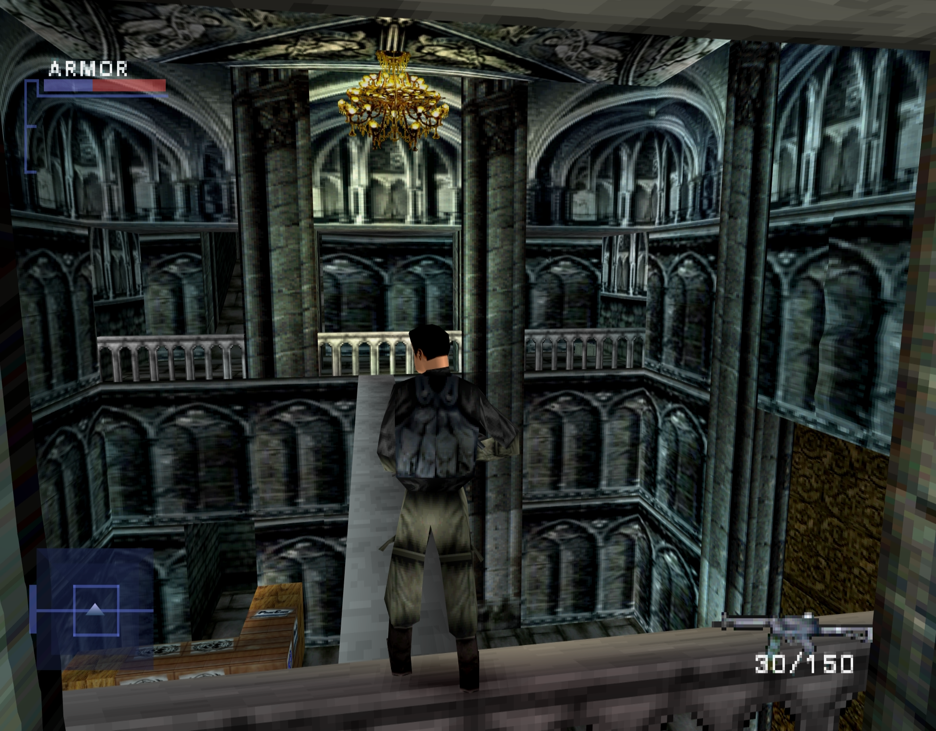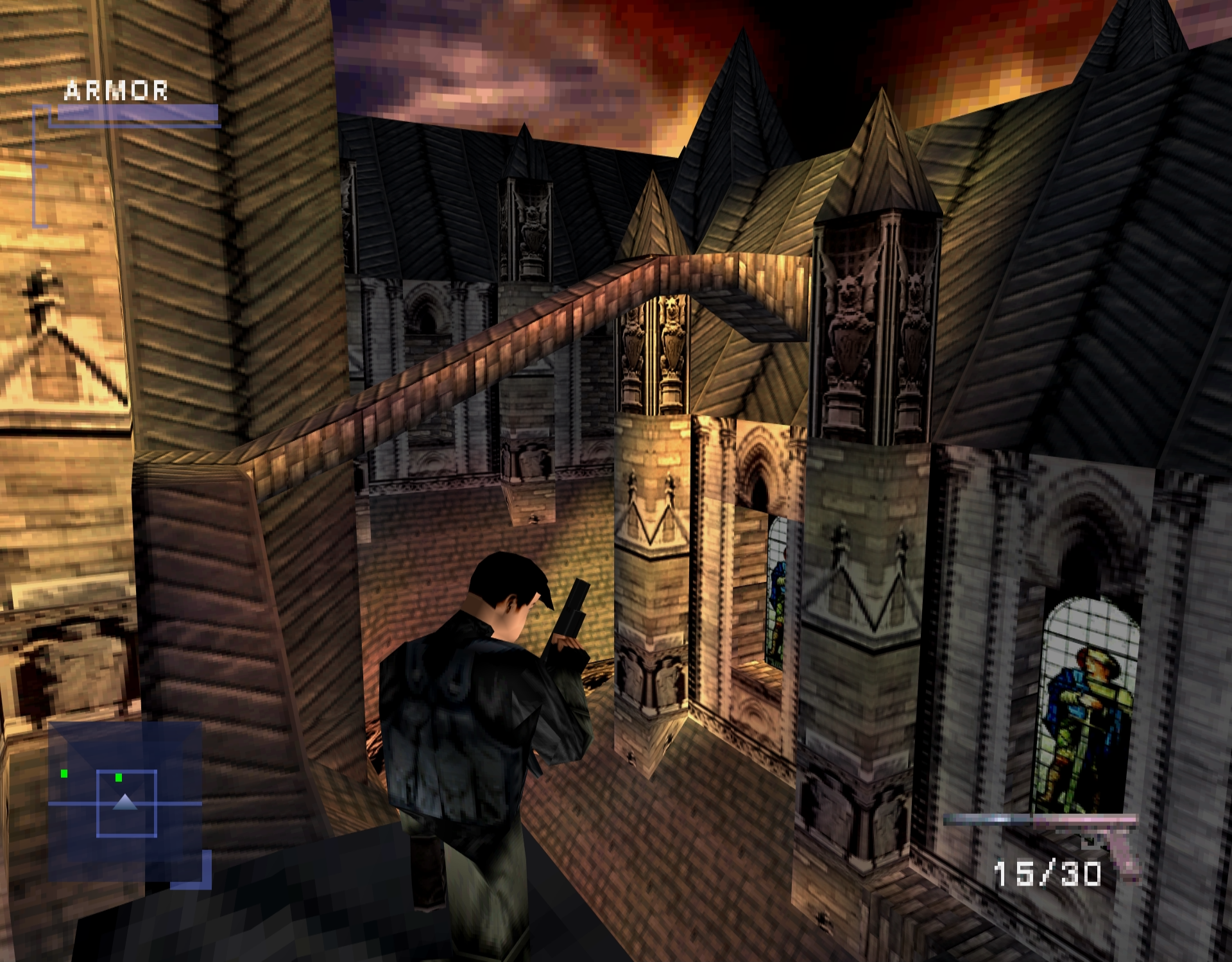 Most of the cut scenes are pretty lame, just like Mission: Impossible; they look like they’re rendered with the in-game engine but the compression makes them look worse than the actual gameplay. But I always thought this was a cool scene: you fall through this skylight and the glass shattering is the epitome of 90’s CGI. It looks pretty crappy by today’s standards but when I see this effect I’m 12 years old again.