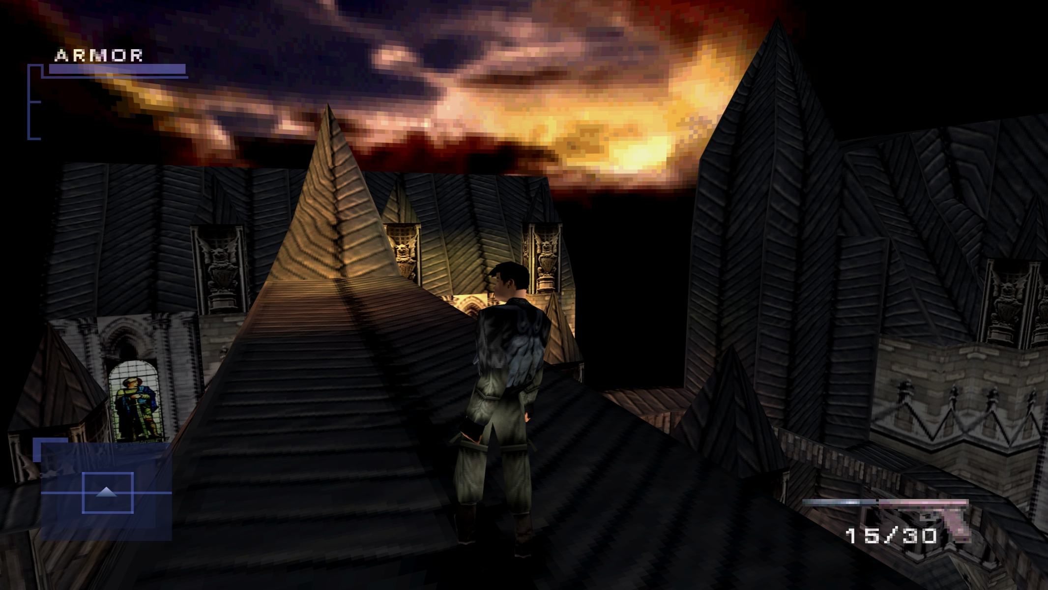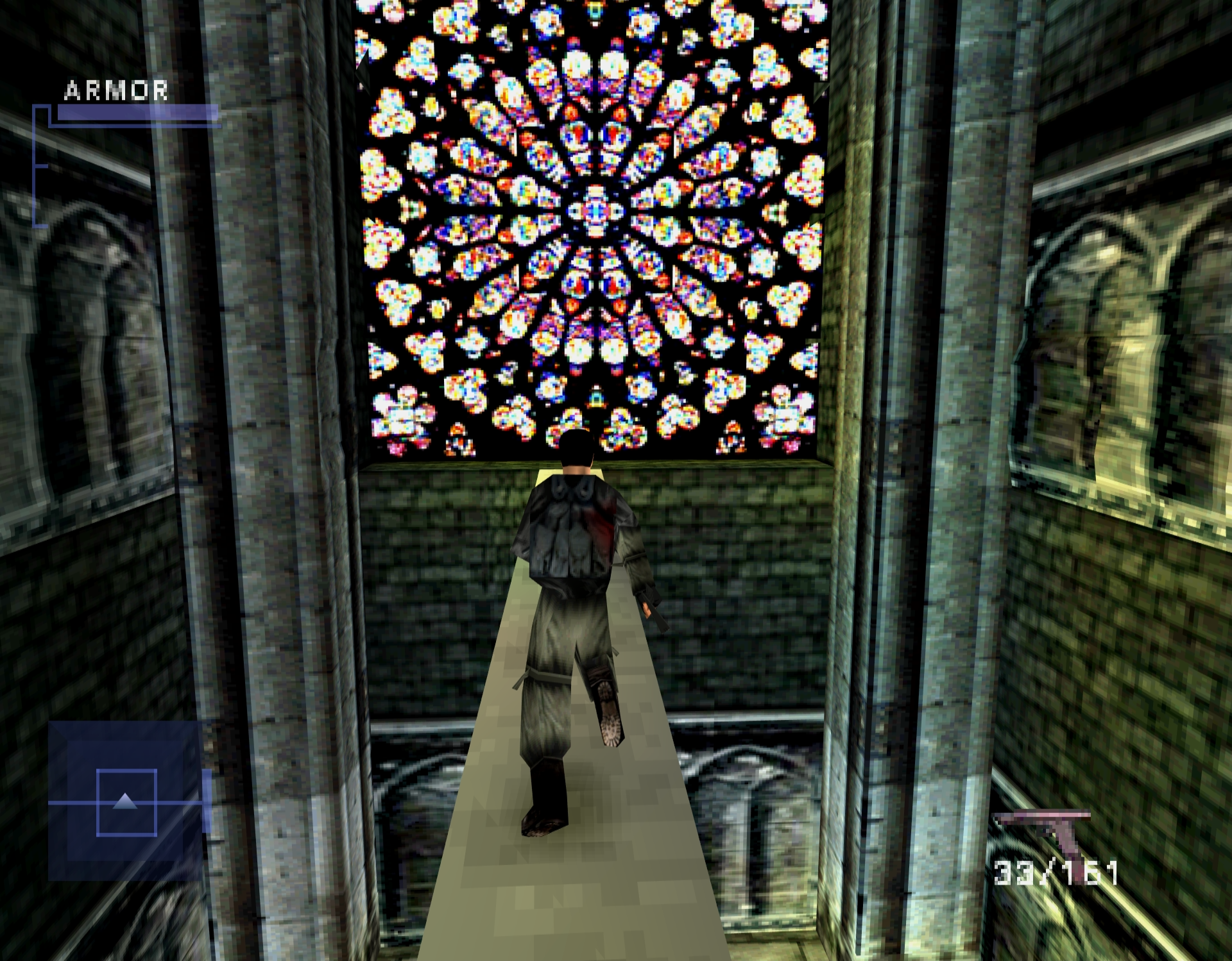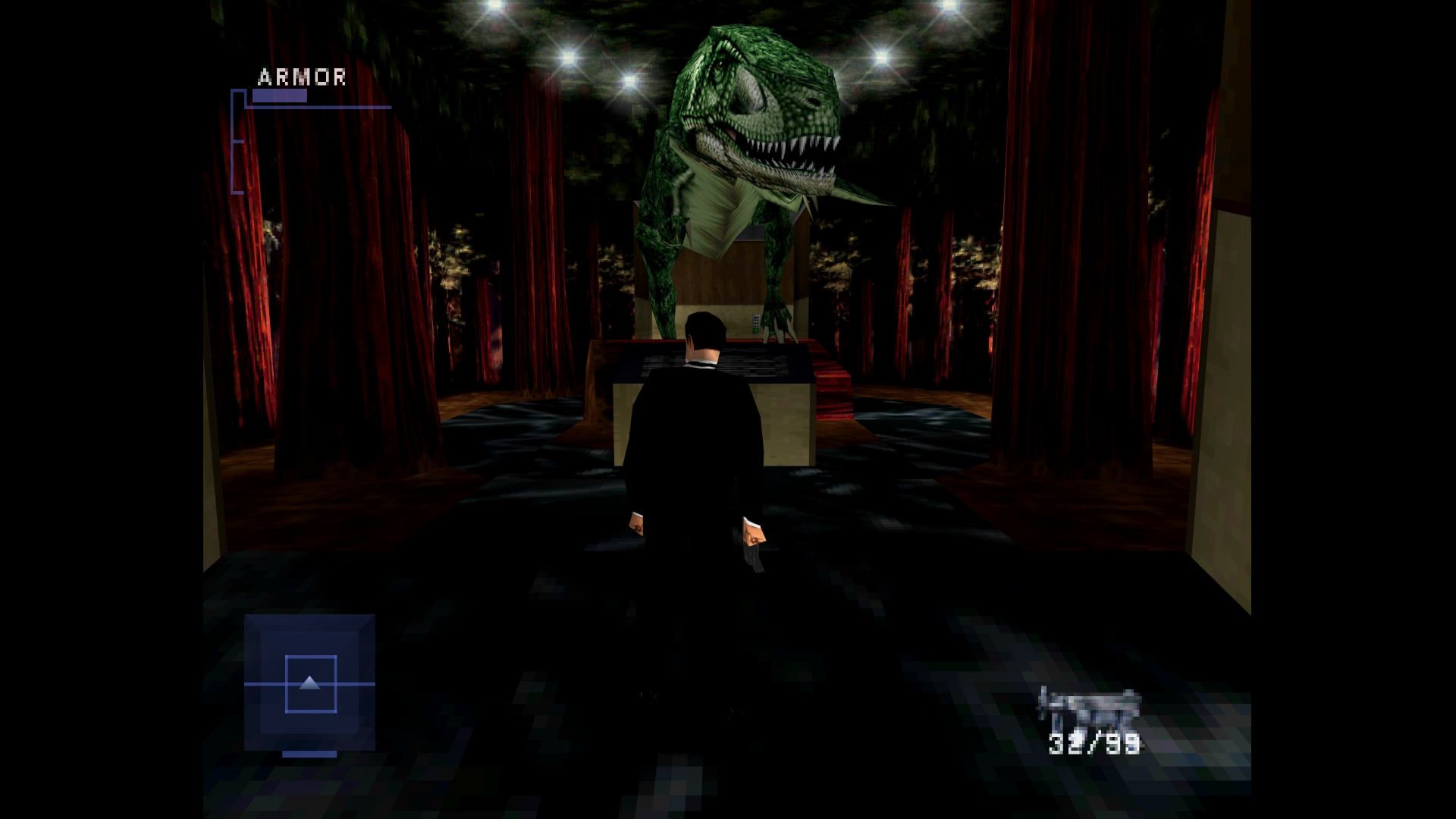 Most of the cut scenes are pretty lame, just like Mission: Impossible; they look like they’re rendered with the in-game engine but the compression makes them look worse than the actual gameplay. But I always thought this was a cool scene: you fall through this skylight and the glass shattering is the epitome of 90’s CGI. It looks pretty crappy by today’s standards but when I see this effect I’m 12 years old again.