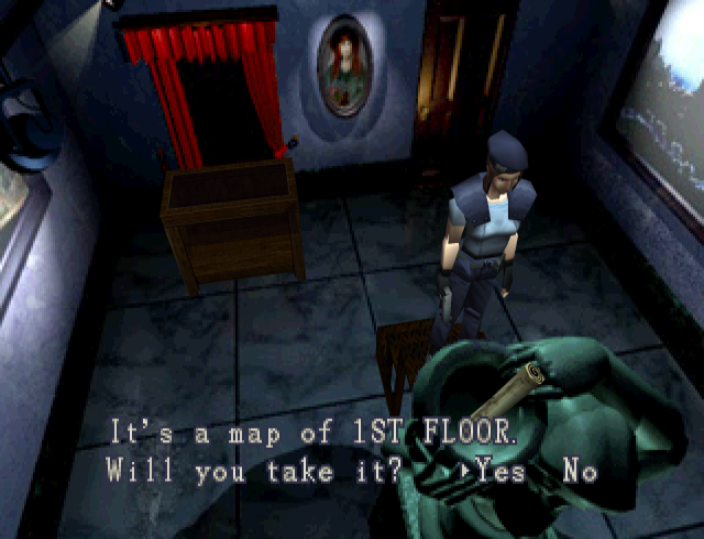 Another element making this game feel like a Japanese B-movie is the way the story sequences are presented; in contrast to RPG’s of the time that rarely or never moved the camera around Resident Evil gets up close with very cinematic angles. That’s also why Final Fantasy VII stunned on release in 1997; I remember being blown away just seeing the environments in magazine previews for that game.