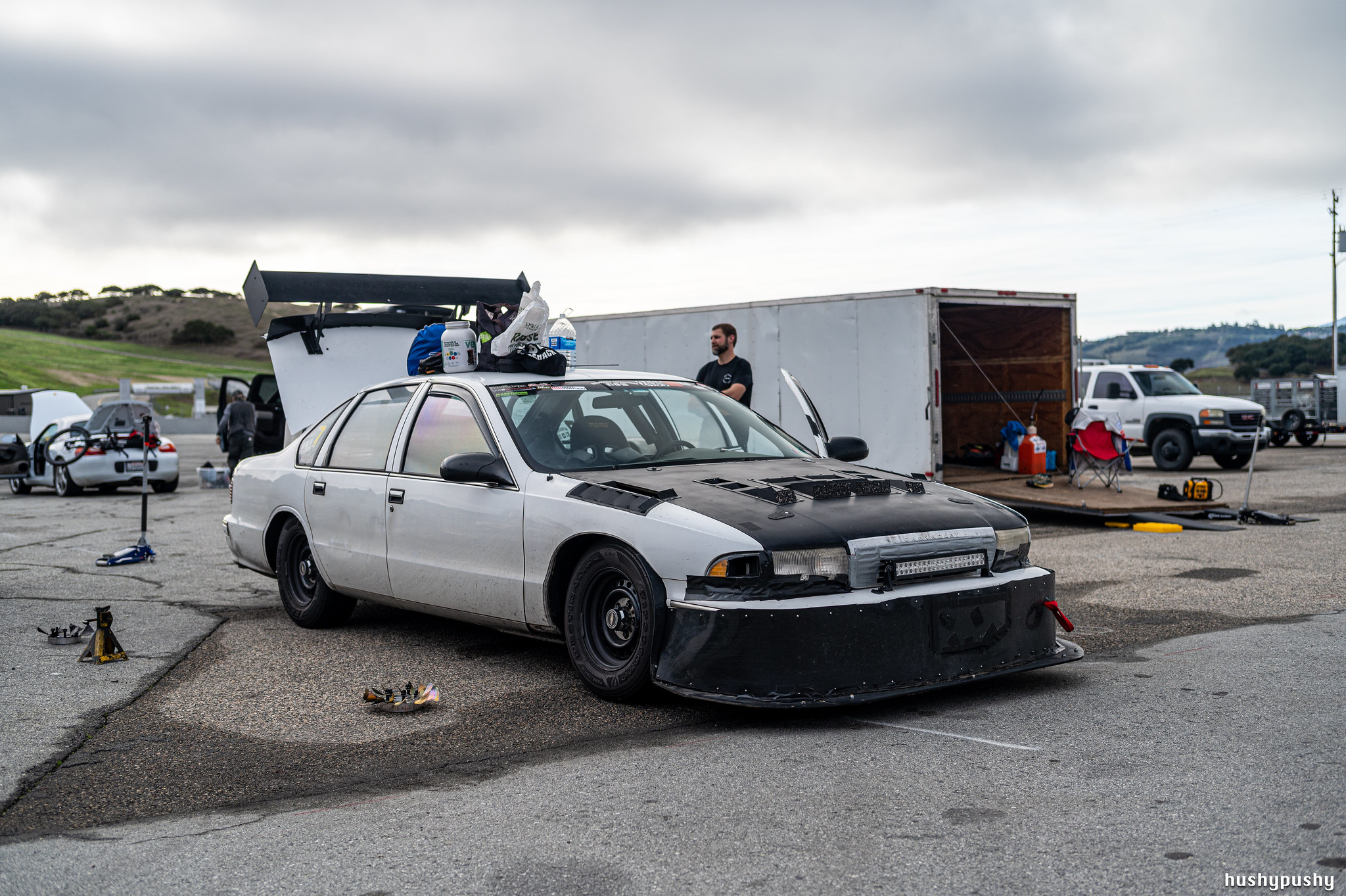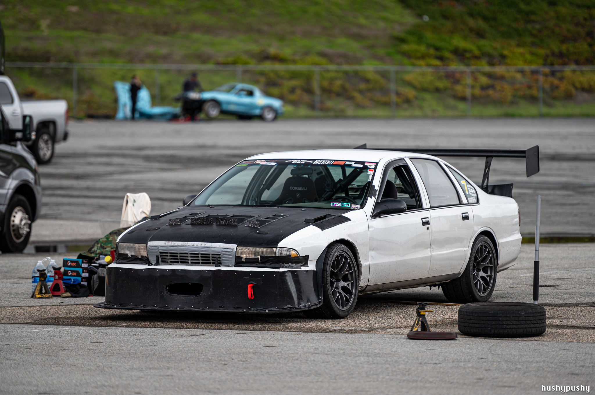Track rubber installed on the Caprice, finally. See that NB Miata in the background? Apparently they crashed very early in the day (first session?) and then parked all the way at the edge of the paddock as they worked on the car with a bit of embarrassment hanging over them.