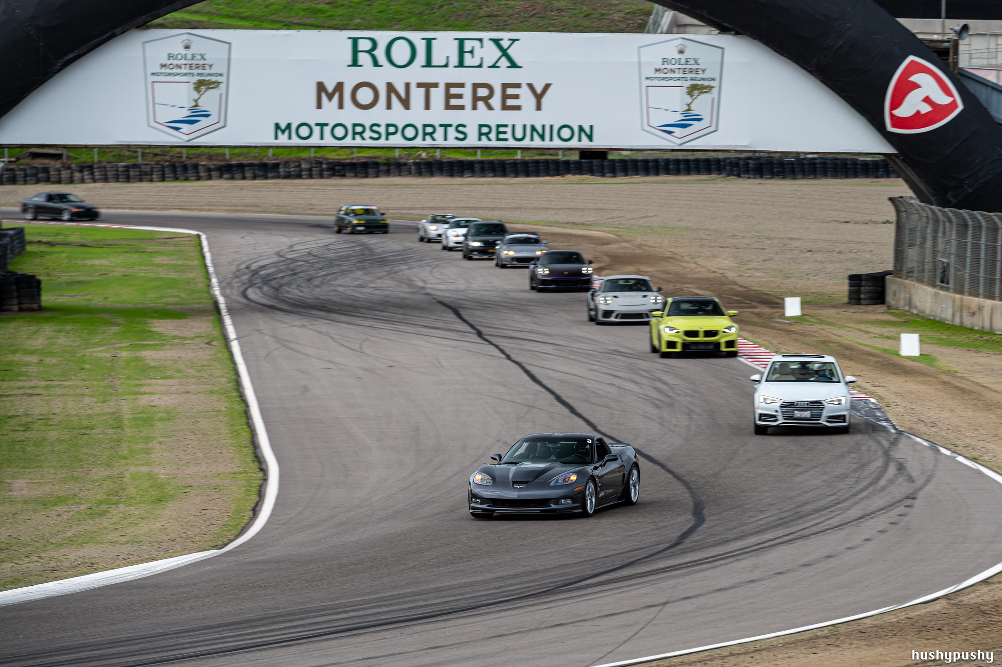 Now that’s a lot of cars in one shot! But what is happening? Note the ZR1 in the lead with the hazards on; that’s an instructor leading a novice group, and they’re doing a lead-follow to get everyone used to driving on the racing line.