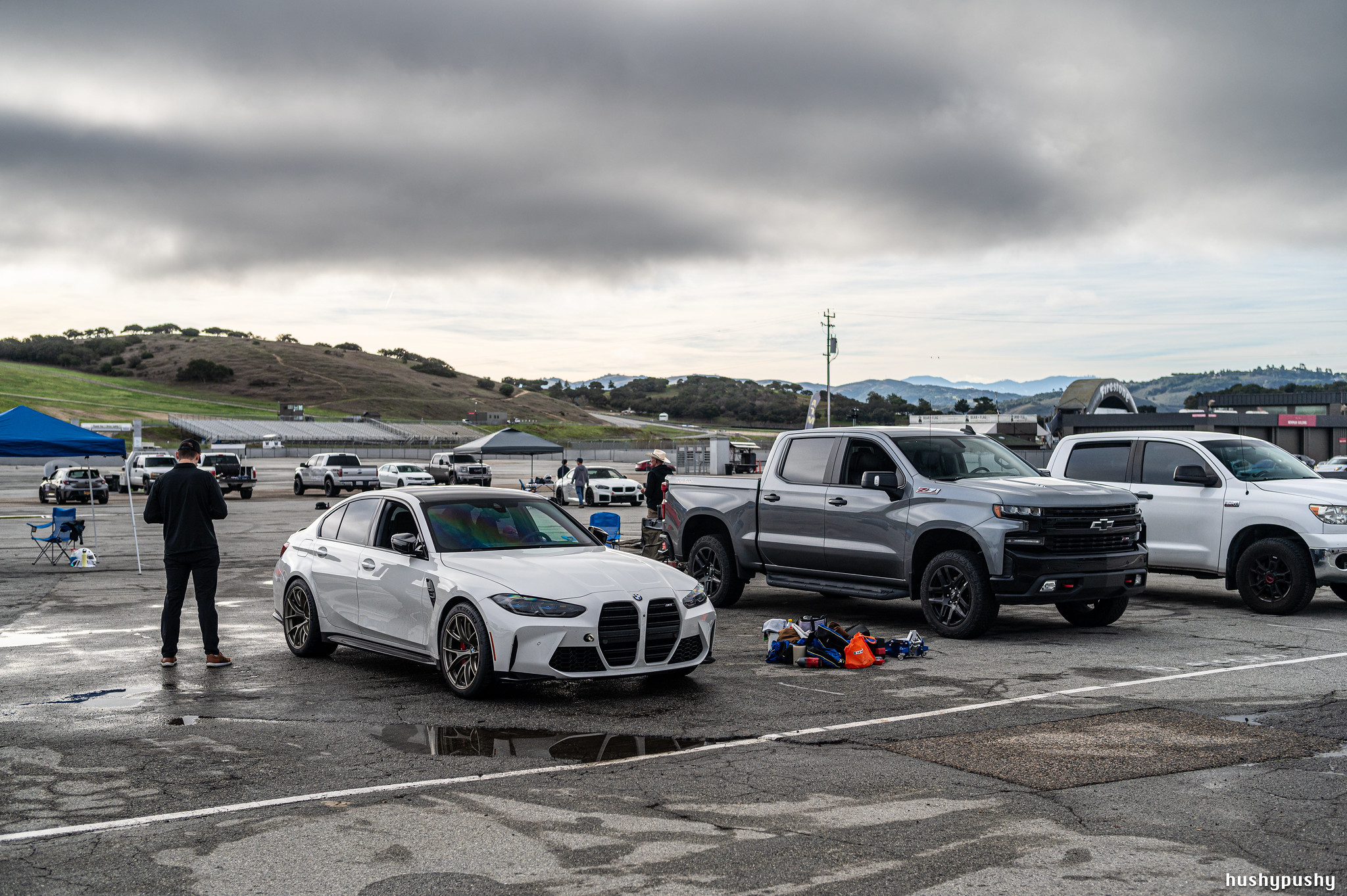 At the end of the day, Chris asked me to get some shots of the three of our cars in the paddock. But first I had to put my wheels back on and put everything back into my car, which took forever because I just had a ton of stuff to pack. So I had Chris move the cars into position while I did that, then rushed to take some snaps.