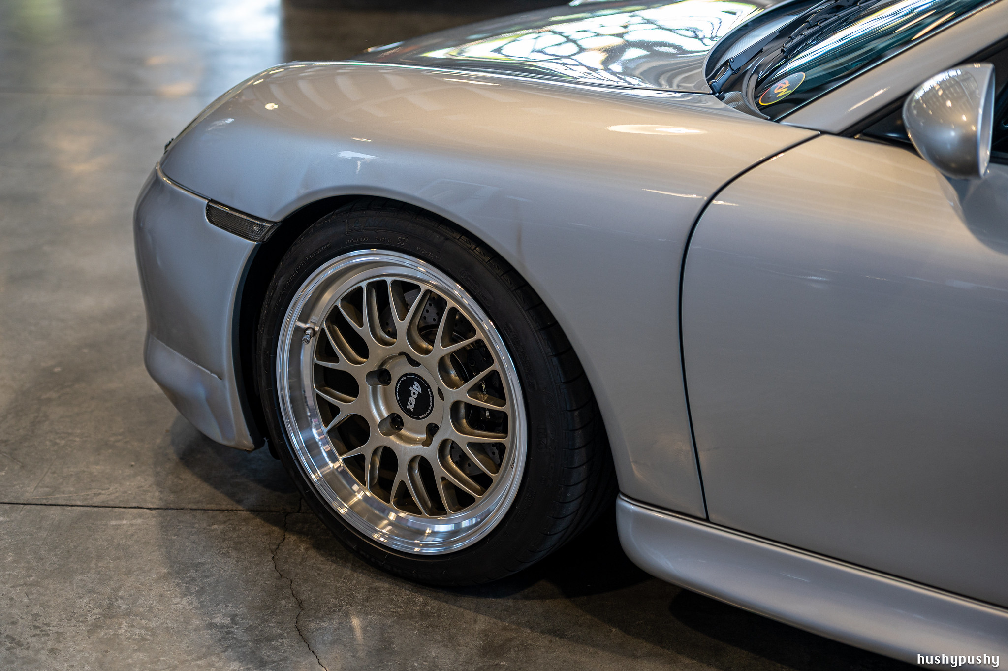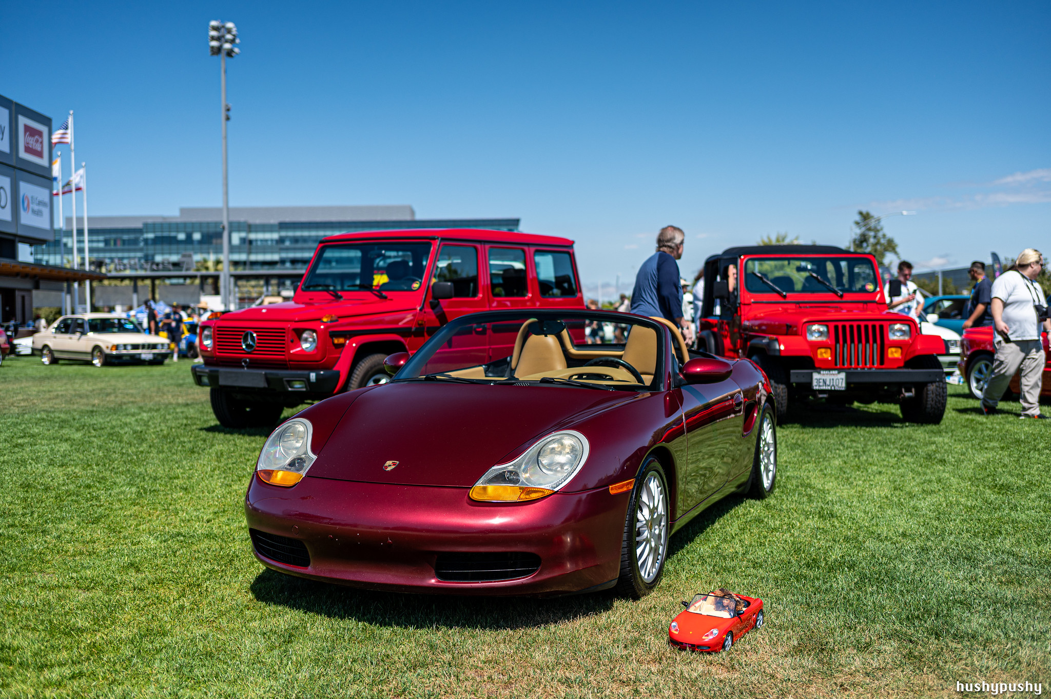 And speaking of pink, right in front of it was this 986 Boxster in the amazing Arena Red. A fairly dark red, it pops into bright pink when the sun hits it, as you can see on the front bumper.