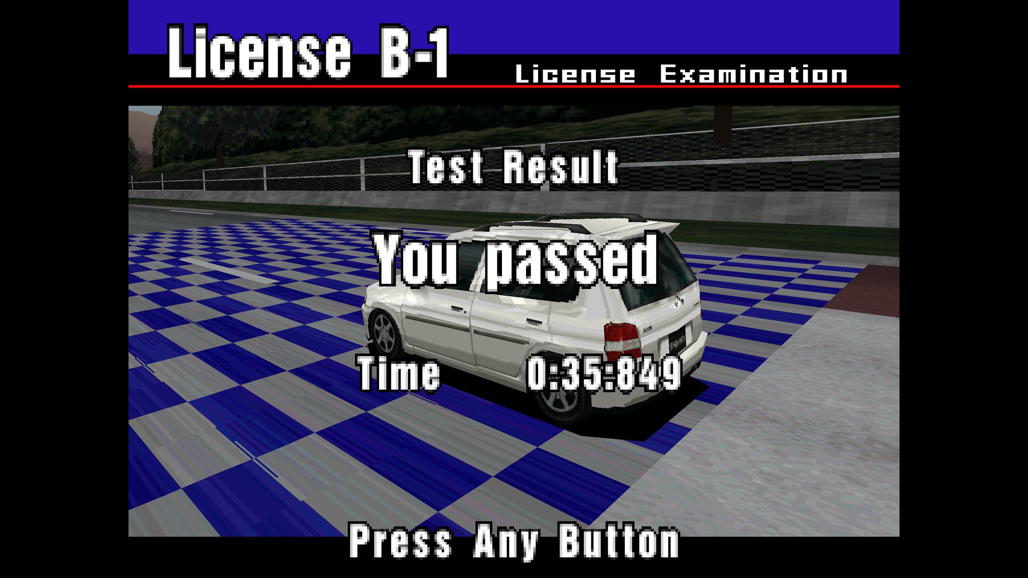 Anyway, back to the license tests. Another thing Gran Turismo gave us was the most intuitive controls and physics to date. Even today, racing games struggle to make their gameplay feel intuitive; in the 90’s, every racing game in existence had some sort of learning curve where you had to feel out what the game wants from you. This was still a factor in Gran Turismo, but to far less of a degree than anything that had come before it. The first license test, shown above, is simple: from a standing start, you need to accelerate in a straight line and brake inside a box 1000 meters away. So intuitive are the physics and controls that on my very first attempt ever, I stopped in the box and passed the test. From a modern perspective this might seem easy. Anyone who has made a racing game will tell you it isn’t. Back in the 90’s this was practically wizardry.