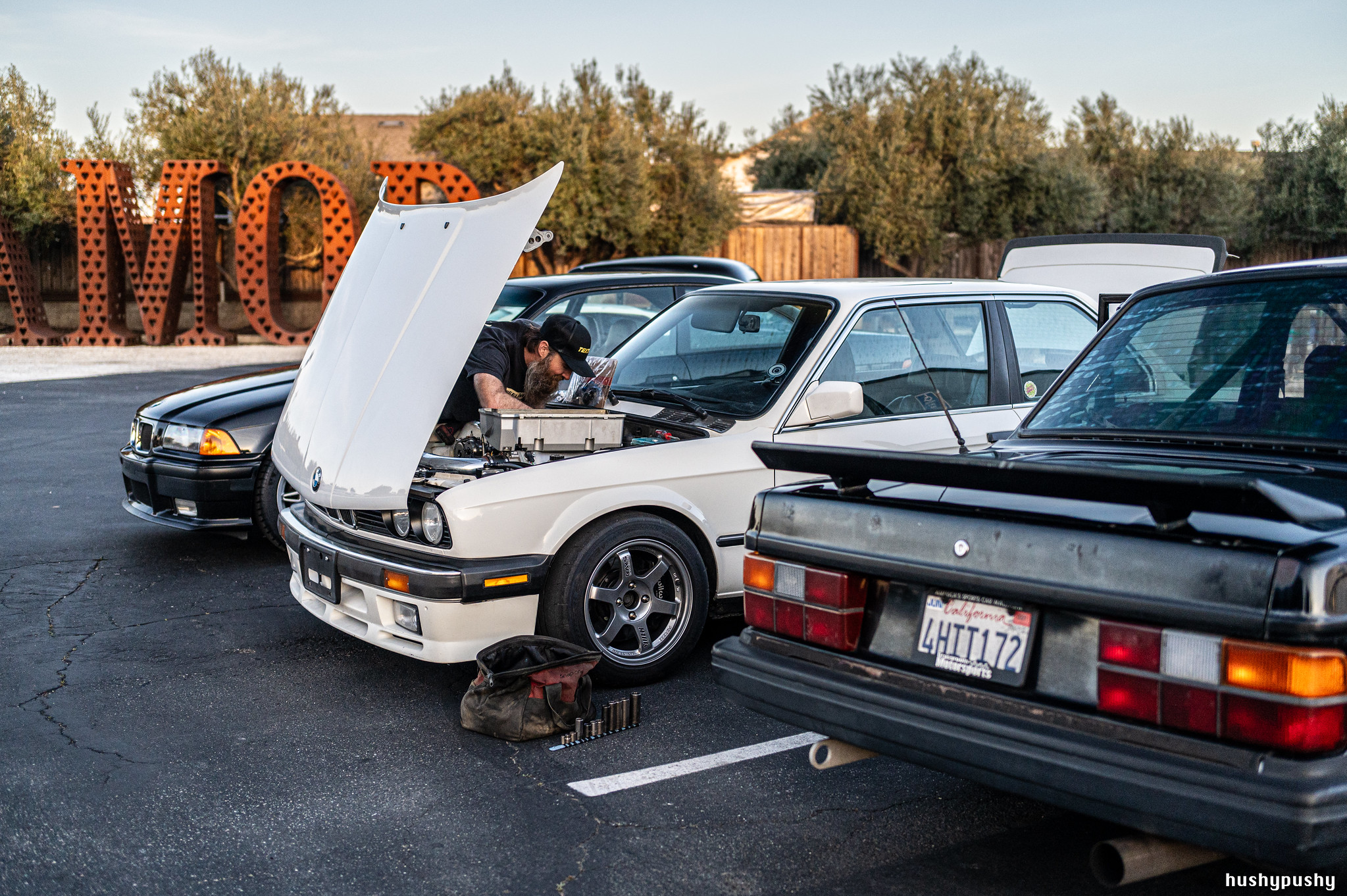 Back at the hotel, and Ryan was already digging into the first of many repairs, tweaks, and fixes to the E30.