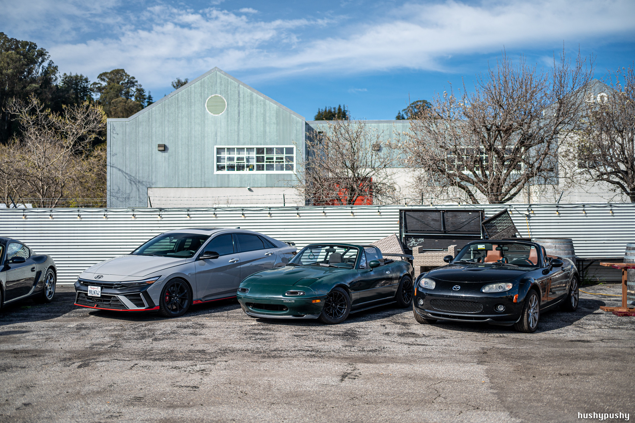 Even though this was a Thursday meet, there was an impressive turnout of local DWAers. I was very interested in comparing the sizes of these NA and NC Miatas. And look how reasonably sized the Elantra N appears even next to a tiny Miata. I think the facelift version of that Hyundai actually looks pretty badass.