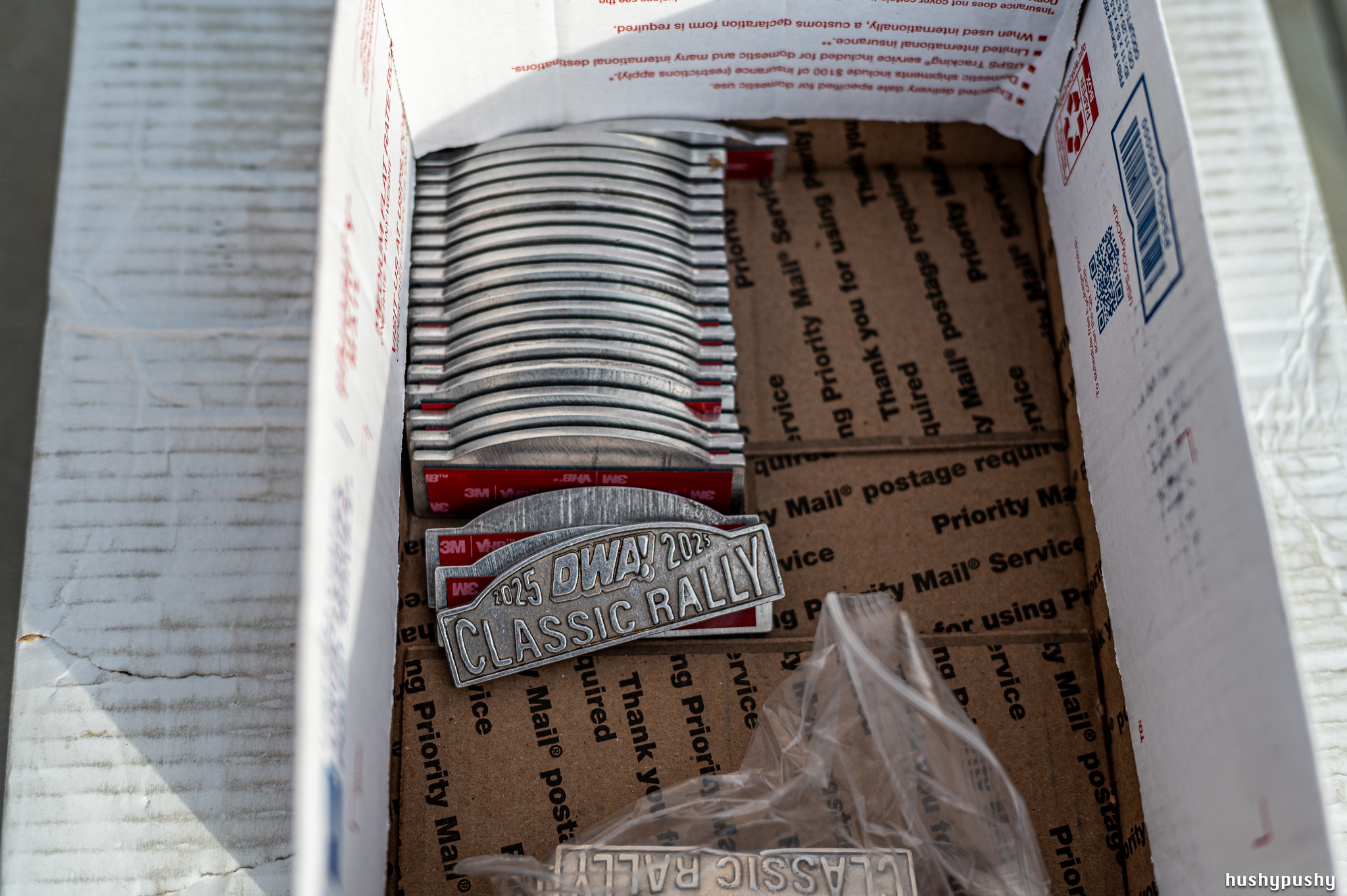 Rally swag! Before the rally, everyone gets to pick up their rally guidebook and supplies. We got some snacks, hot sauce, cleaning supplies, and t-shirts.