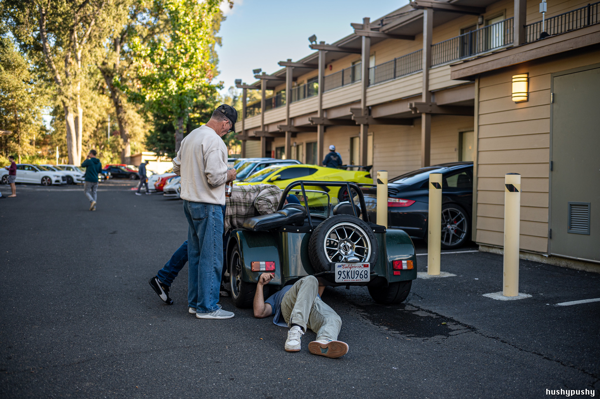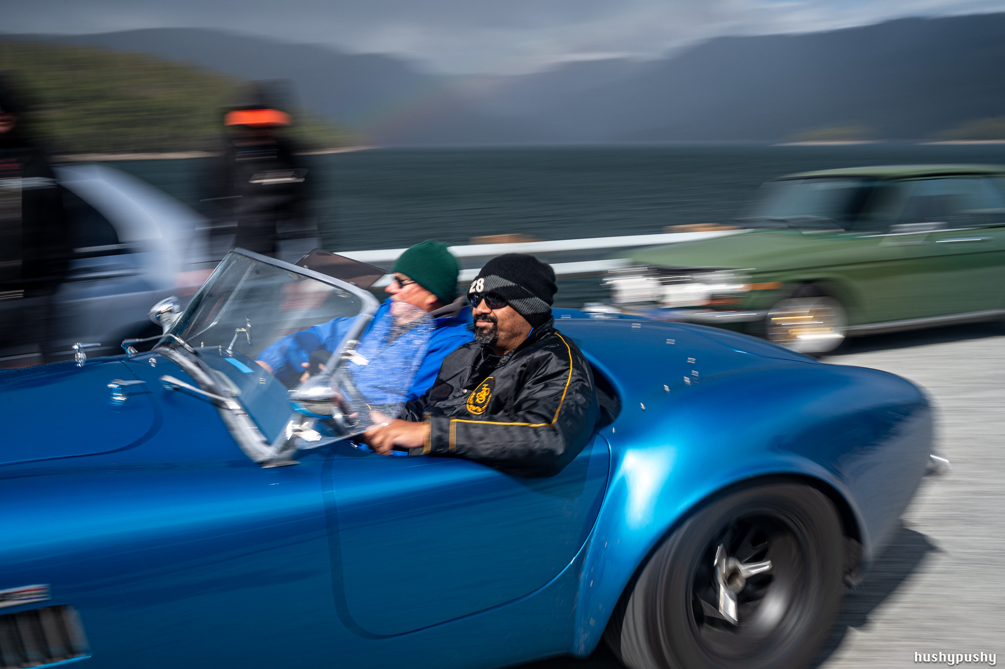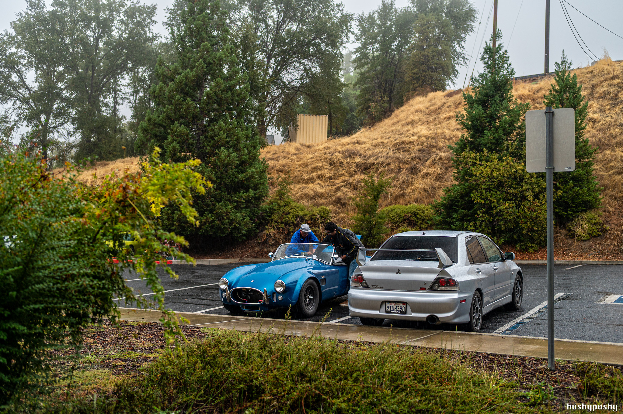 As you would expect from Northern California in October, it was raining a bit. As soon as they arrived at the hotel, the Cobra team scrambled to put the cockpit tonneau cover on. They drove the entire rally in this Superformance replica with absolutely no top at all! Apparently the aerodynamics are actually decent; as long as you’re moving, the rain goes over the car. The co-driver told me this was much better than his old MG A, where the water would simply go over the windscreen and back into the cockpit.