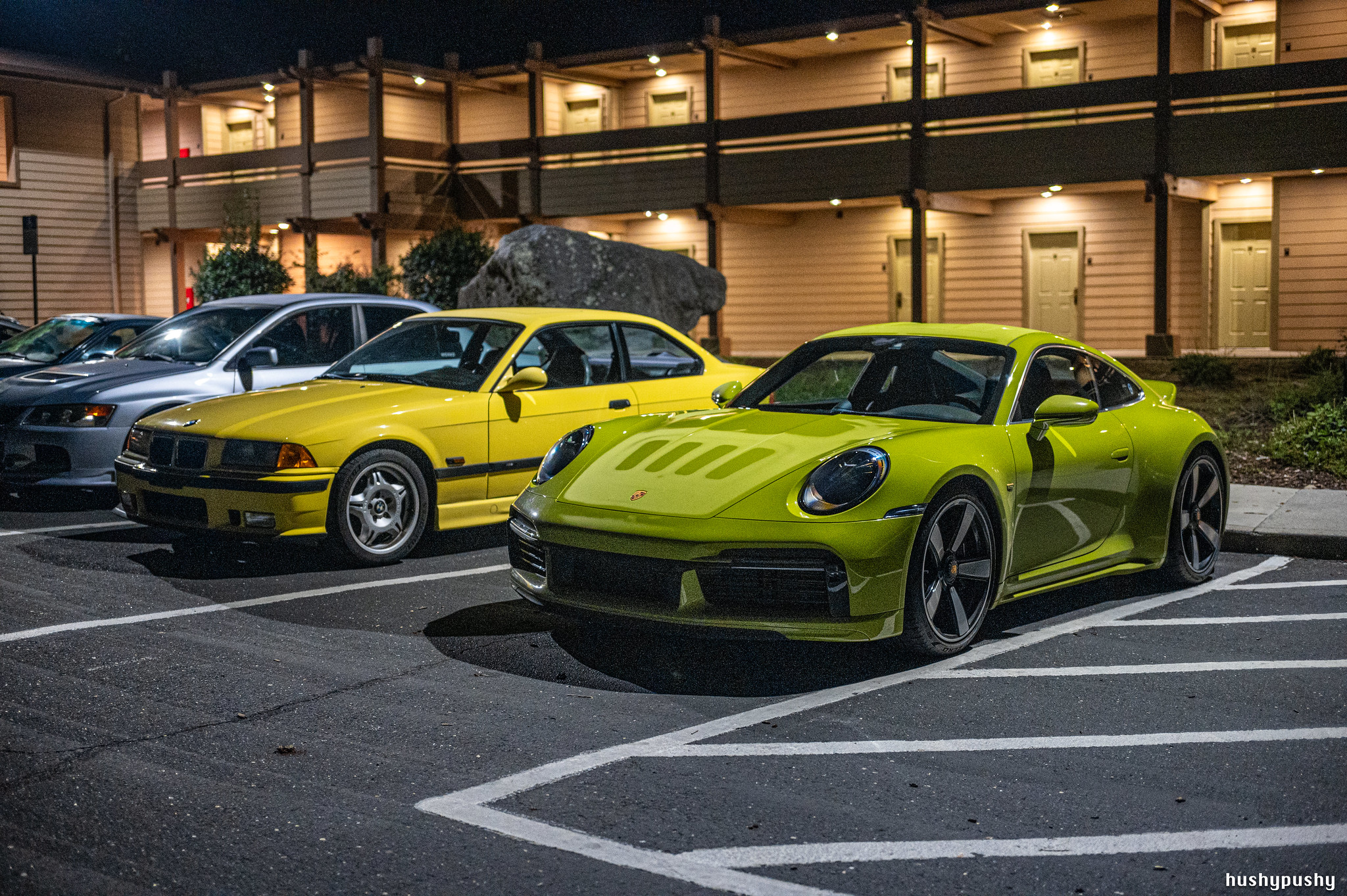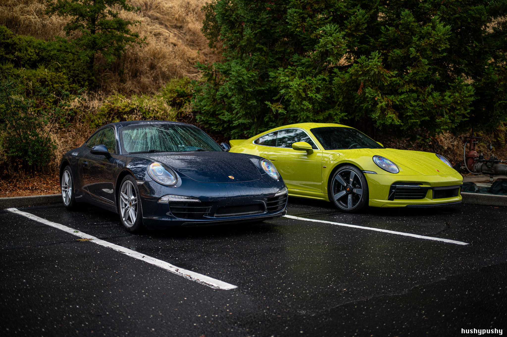 Here’s a comparison between the current and previous generations of Porsche 911: 991.1 and 992.1. The Sport Classic on the right is the only one made in Linden Green, which is a very interesting color. They call it a “green” but it certainly looks yellow to me. We had wildly varying weather conditions throughout the rally, which made me even more appreciative of the nuances of this color.