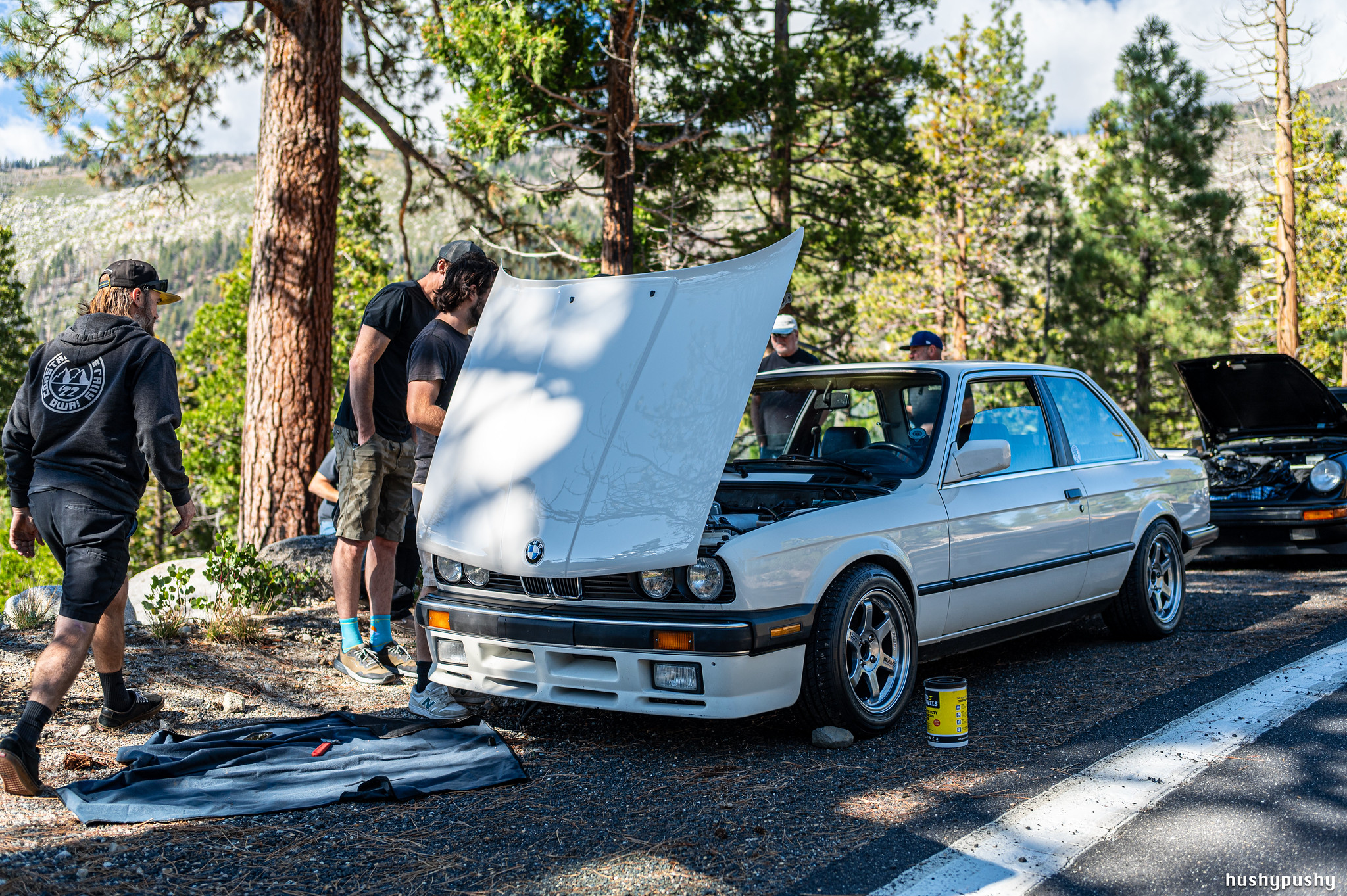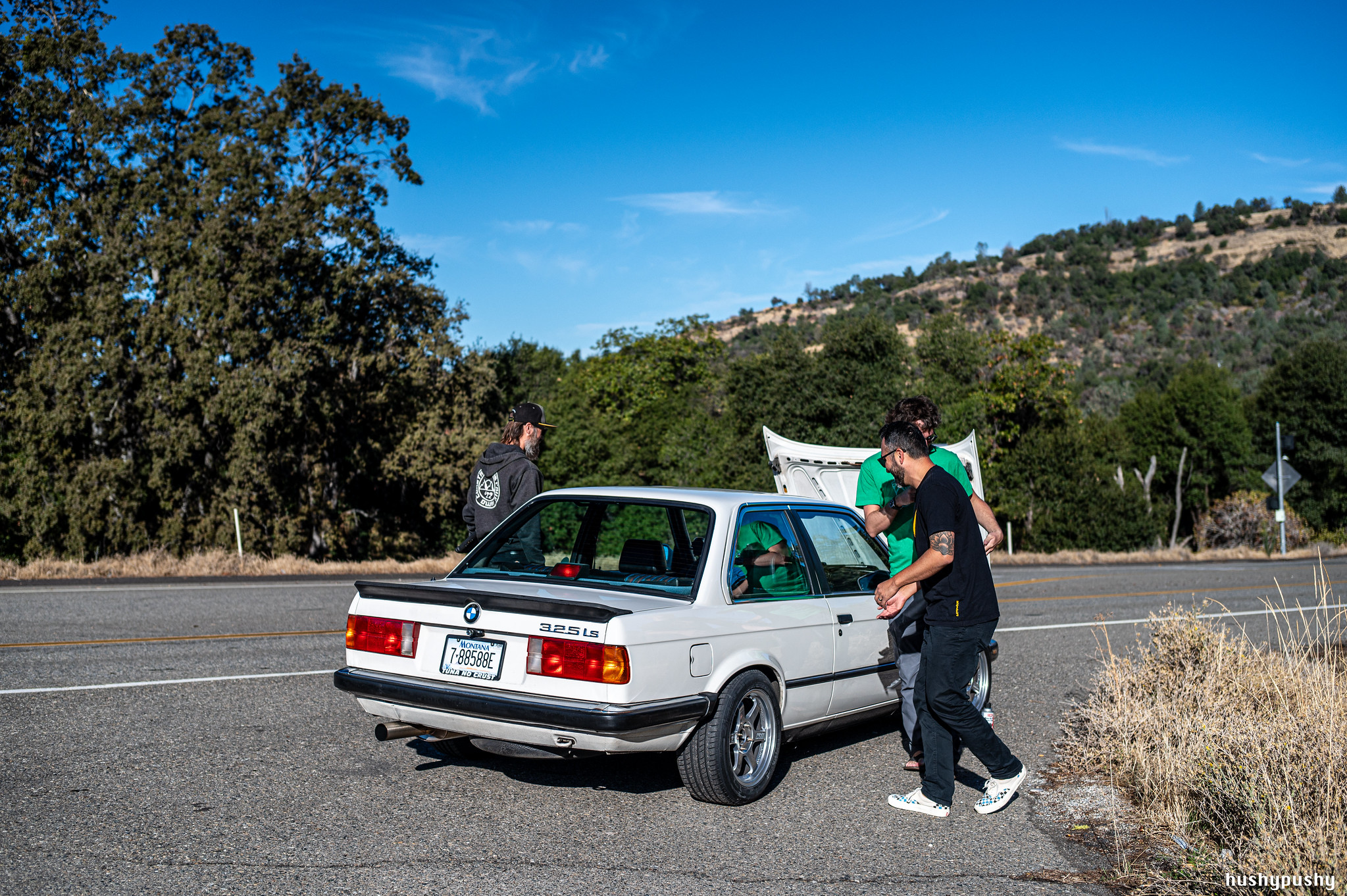 Oh bother. The K24 had been plumbed to the OEM BMW oil cooler, and one of the fittings ripped off and promptly dumped all of the engine oil over the highway–as well as the right front tire and brake of the E30. Luckily, we didn’t notice any nasty fluids on the ground, and Art was able to safely bring the car to a stop in a good place. That could have turned out extremely bad on a road like this.