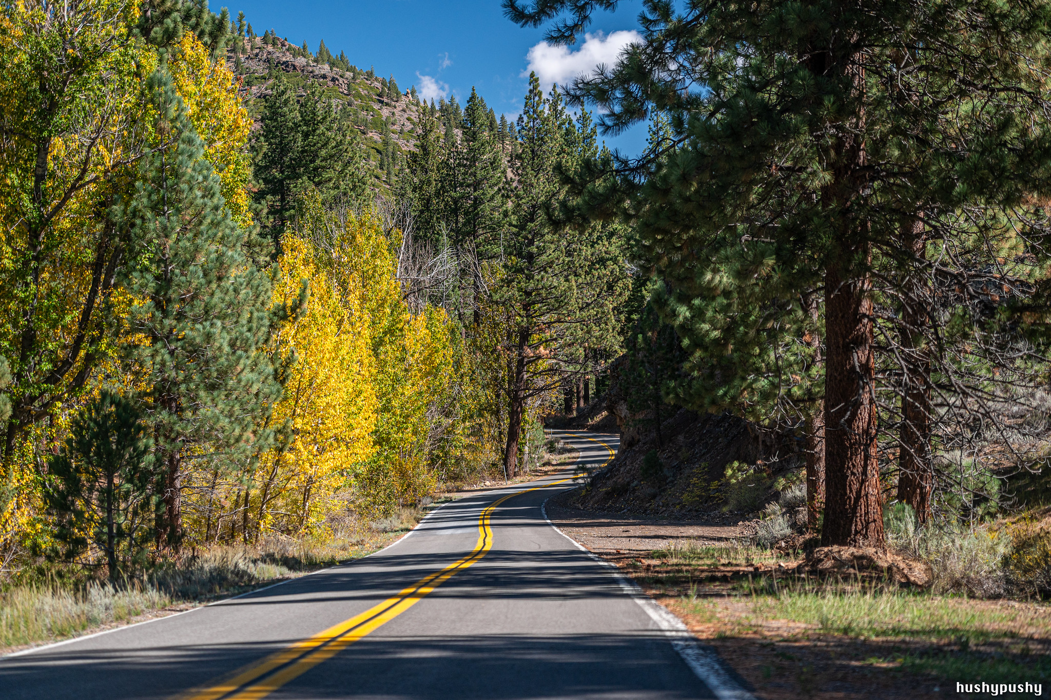 Then the road smooths out and gets wider, gaining a double yellow line again. I love the juxtaposition of evergreens against the yellows and reds of trees changing color.